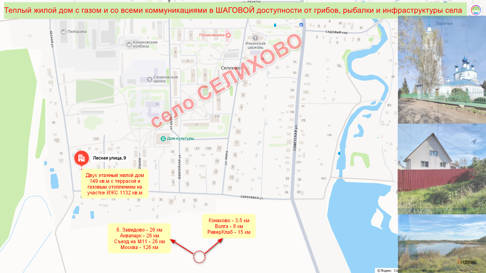 В зеленой зоне села Селихово, где экология и природная красота сочетается с городской инфраструктурой, продается НОВЫЙ дом из бруса с двойным утеплением - не страшен любой мороз, и с автономным отоплением от газового котла на участке ИЖС 1132 кв.м - можно воплотить самые дерзкие планы от зарыбленного пруда до фруктового сада... Лес и тихая охота через дорогу, до рыбалки 800 метров, Конаковские курорты РиверКлаб 15 км, Б. Завидово с водным кластером и развязка М11 - 26 км.